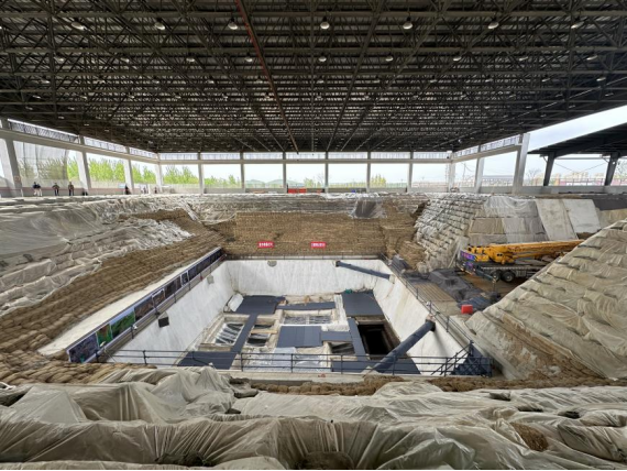安徽省文物考古研究所研究員、武王墩考古項目負責人宮希成介紹,武王墩一號墓外圍設有獨立陵園。陵園內(nèi)發(fā)現(xiàn)有車馬坑、陪葬墓、祭祀坑等遺跡。車馬坑位于武王墩一號墓西側(cè),南北長約148米,東西寬約14米,是已發(fā)掘探明楚墓車馬坑中最長的一座。武王墩一號墓為陵園主墓,是一座帶封土的“甲”字形豎穴土坑墓,是已發(fā)掘楚墓中最大的一座。封土堆整體呈覆斗狀,總面積約1.2萬平方米,整體營建工藝由夯筑和堆筑相結合。發(fā)掘出土有鐵鍤、鐵錛、鐵矛、扇面、竹筐等遺物。