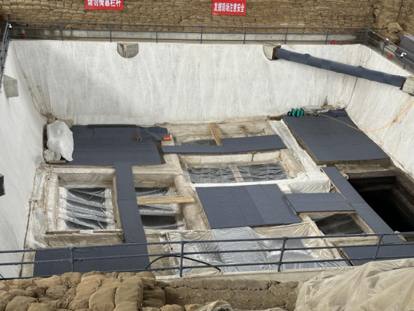 2020年9月起,一號墓發(fā)掘工作開始。至2023年11月,完成封土和填土發(fā)掘,12月提取了槨室上鋪設的竹席。這期間,建設了一號墓現(xiàn)場保護大棚和文物庫房、文物保護實驗室、宿舍等必要的配套設施。2024年3月7日開始拆解提取槨蓋板,至3月27日,四層槨蓋板已全部安全提取完成,共計443根,總重約153噸。現(xiàn)已進入槨室發(fā)掘第二階段,即槨室內(nèi)部的發(fā)掘清理。