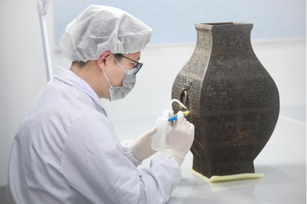“在武王墩一號墓考古發(fā)掘過程中,國家文物局考古研究中心、北京科技大學、中國絲綢博物館等組成的文物保護團隊緊密配合考古發(fā)掘工作,通過多學科、多平臺協(xié)作,運用科學技術提供的新手段新工具,開展槨室環(huán)境控制及各類出土文物的加固提取與穩(wěn)定性保護,保障了考古發(fā)掘工作的順利開展和文物安全?!睆堉螄榻B。